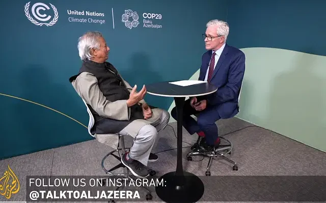 সম্প্রতি আজারবাইজানের রাজধানী বাকুতে অনুষ্ঠিত জাতিসংঘের জলবায়ু সম্মেলনের (কপ২৯) ফাঁকে আল–জাজিরাকে এই সাক্ষাৎকার দেন প্রধান উপদেষ্টা ড. মুহাম্মদ ইউনূস