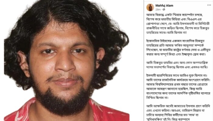 ফেসবুক স্ট্যাটাস মাহফুজ বলেন, অতঃপর মুজিববাদ, ইসলামোফোবিয়া, ইসলামবাদী মতাদর্শ বিরোধী বাঙালি মুসলমানদের ঐতিহাসিক আকাঙ্ক্ষার বিরুদ্ধে ‘একাকী’ পথ চলতে হলো। পরে, আমি সাংস্কৃতিক সক্রিয়তা এবং রাজনৈতিক গবেষণা বৃত্তের সঙ্গে জড়িত, যা জুলাই-আগস্টের উত্থানে আমার রাজনৈতিক এবং বুদ্ধিবৃত্তিক ভূমিকার পথ সুগম করে।