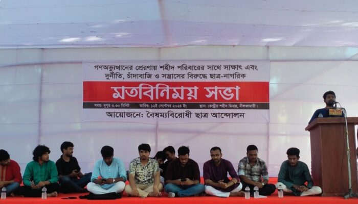 বৃহস্পতিবার (১২ সেপ্টেম্বর) বিকেলে নীলফামারী কেন্দ্রীয় শহীদ মিনার চত্বরে গণ অভ্যুত্থানের প্রেরণায় শহীদ পরিবারে সাথে সাক্ষাৎ এবং দুর্নীতি, চাঁদাবাজী ও সন্ত্রাসের বিরুদ্ধে ছাত্র-নাগরিক মতবিনিময় সভায় তিনি এসব কথা বলেন।