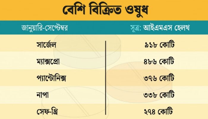 সার্জেল ছাড়াও গত কয়েক বছর ধরে আরও কয়েকটি ওষুধ অনেক বিক্রি হচ্ছে উল্লেখ করে হালিমুজ্জামান জানান, গত নয় মাসে চতুর্থ সর্বোচ্চ বিক্রিত ওষুধ নাপা। এর পরিমাণ ৩৩৮ কোটি টাকা।