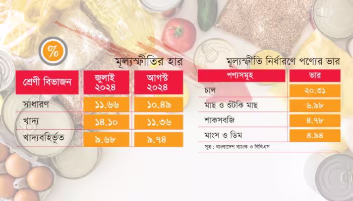 প্রতিটি পণ্য ও সেবার ভার নির্ধারণ করে এর বিপরীতে পণ্যটির মূল্যবৃদ্ধির হার হিসাব করে মূল্যস্ফীতি নির্ধারণ করা হয়ে থাকে। বাংলাদেশ ব্যাংক থেকে প্রকাশিত মূল্যস্ফীতির হিটম্যাপের তথ্য অনুযায়ী, মূল্যস্ফীতির হিসাবের ক্ষেত্রে দানাদার খাদ্যশস্যের ওয়েট বা ভার রয়েছে ২১ শতাংশের বেশি। এর মধ্যে চালের ভার ২০ দশমিক ৩১ শতাংশ। আর ডিমের ভার প্রায় ৫ শতাংশ। এছাড়া মাছের ভার প্রায় ৭ শতাংশ ও মসলার ৪ শতাংশের বেশি। আগস্টে এসব পণ্যের দাম কমেনি। উল্টো চাল ও ডিমসহ অনেক নিত্যপণ্যের দাম বেড়েছে। কেবল সবজির দাম কিছুটা কমেছিল। যদিও মূল্যস্ফীতির হিসাবে সবজির ভার কেবল ৪ দশমিক ৭৮ শতাংশ।