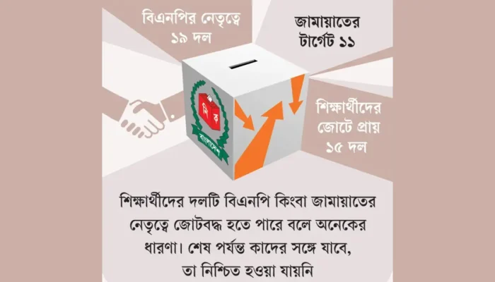 শিক্ষার্থীদের সঙ্গে জোট: বৈষম্যবিরোধী ছাত্র আন্দোলন ও জাতীয় নাগরিক কমিটির গঠিত নতুন দলের নেতৃত্বেও একটি জোট গঠন হতে পারে বলে ধারণা করছে সরকারের একাধিক গোয়েন্দা সংস্থা। শিক্ষার্থীদের দলটি দেশের প্রধান রাজনৈতিক দল বিএনপি কিংবা জামায়াতে ইসলামী নেতৃত্বেও জোটবদ্ধ হতে পারে বলে ছাত্র আন্দোলনের কেউ কেউ ধারণা করছেন। শেষ পর্যন্ত কোন দলের সঙ্গে যাবে, তা এখনো নিশ্চিত হওয়া যায়নি।