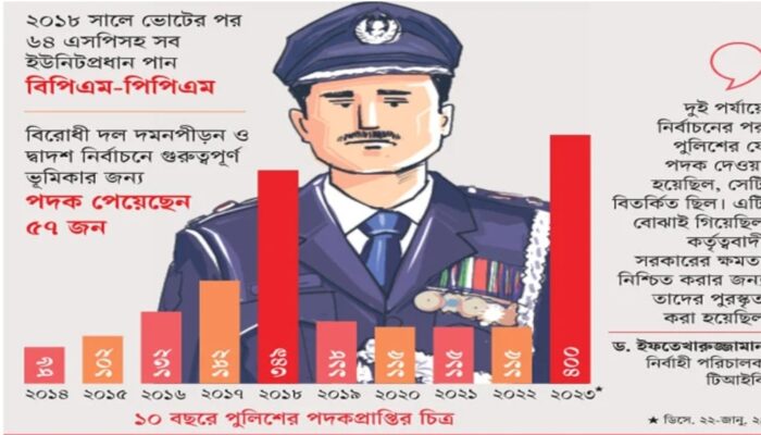 গত ১০ বছরের পুলিশ পদকের তালিকা বিশ্লেষণ করে দেখা যায়, একাদশ জাতীয় সংসদ নির্বাচন ও দ্বাদশ জাতীয় সংসদ নির্বাচনের বছরে পুলিশ পদকের হিড়িক পড়ে যায়। ২০১৮ সালের নির্বাচনের বছরে ৩৪৯ জনকে বিপিএম-পিপিএম দেওয়া হয়েছিল। দেশের ৬৪ জেলার পুলিশ সুপার (এসপি), সব রেঞ্জ ডিআইজিসহ ইউনিটপ্রধানরা পদক পেয়েছিলেন। এর আগে ৬৪ জেলার এসপিসহ সব ইউনিটপ্রধানের একসঙ্গে পদক পাওয়ার নজির নেই।