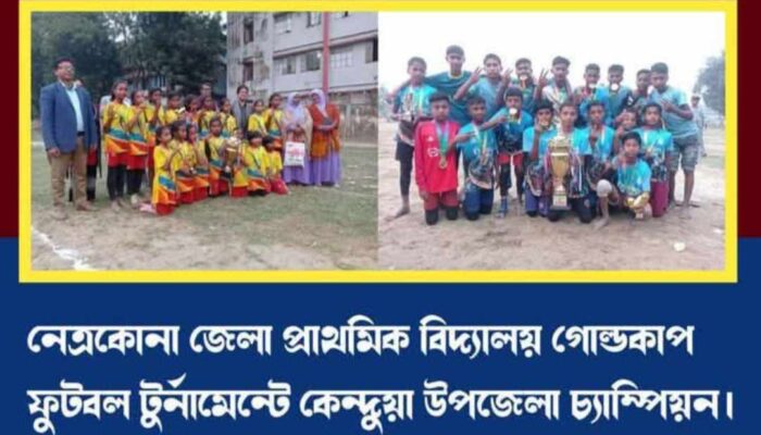 কেন্দুয়া প্রতিনিধিঃ ২০ জানুয়ারি ২০২৫ ইং নেত্রকোনা জেলার প্রাথমিক বিদ্যালয় গোল্ডকাপ ফুটবল টুর্নামেন্টে বালক ও বালিকা উভয় বিভাগে কেন্দুয়া উপজেলা চ্যাম্পিয়ন হয়েছে। সোমবার বিকেলে নেত্রকোনা সদর উপজেলার মুক্তারপাড়া খেলার মাঠে অনুষ্ঠিত এ টুর্নামেন্টে জেলা প্রশাসক বনানী বিশ্বাসের উপস্থিতিতে খেলা অনুষ্ঠিত হয়।