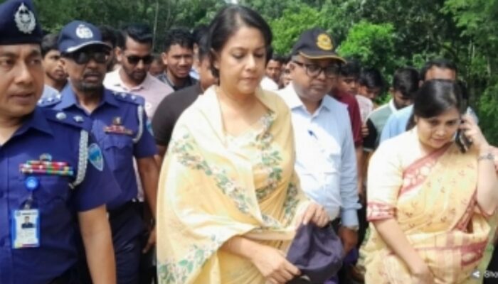 ফেনীর পরশুরামের সীমান্ত সংলগ্ন কালিকাপুর এলাকায় বল্লারমুখ বাঁধ পরিদর্শন করেন পরিবেশ, বন ও জলবায়ু পরিবর্তন মন্ত্রণালয় এবং পানিসম্পদ মন্ত্রণালয়ের উপদেষ্টা রিজওয়ানা হাসান। ছবি: সংগৃহীত