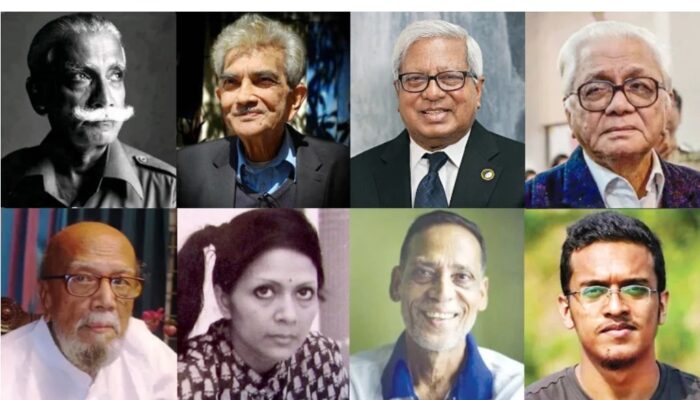 (উপরে বাঁ থেকে) এম এ জি ওসমানী, জামাল নজরুল ইসলাম, স্যার ফজলে হাসান আবেদ, বদরুদ্দীন উমর; (নিচে বাঁ থেকে) আল মাহমুদ, নভেরা আহমেদ, আজম খান ও আবরার ফাহাদ